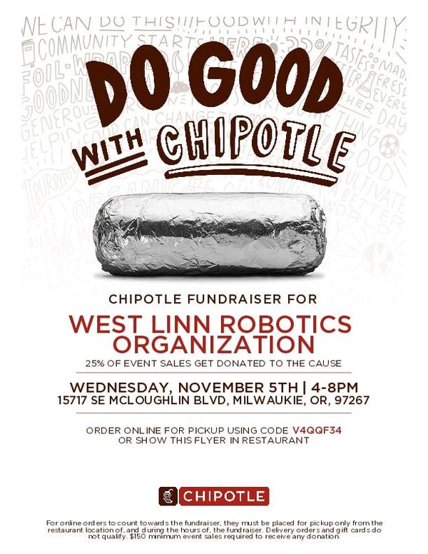 Come support the team at our dine out at the McLoughlin Blvd Chipotle on November 5th from 4 - 8 PM. Any and all support is hugely appreciated, as 25% of the proceeds will go to our team!